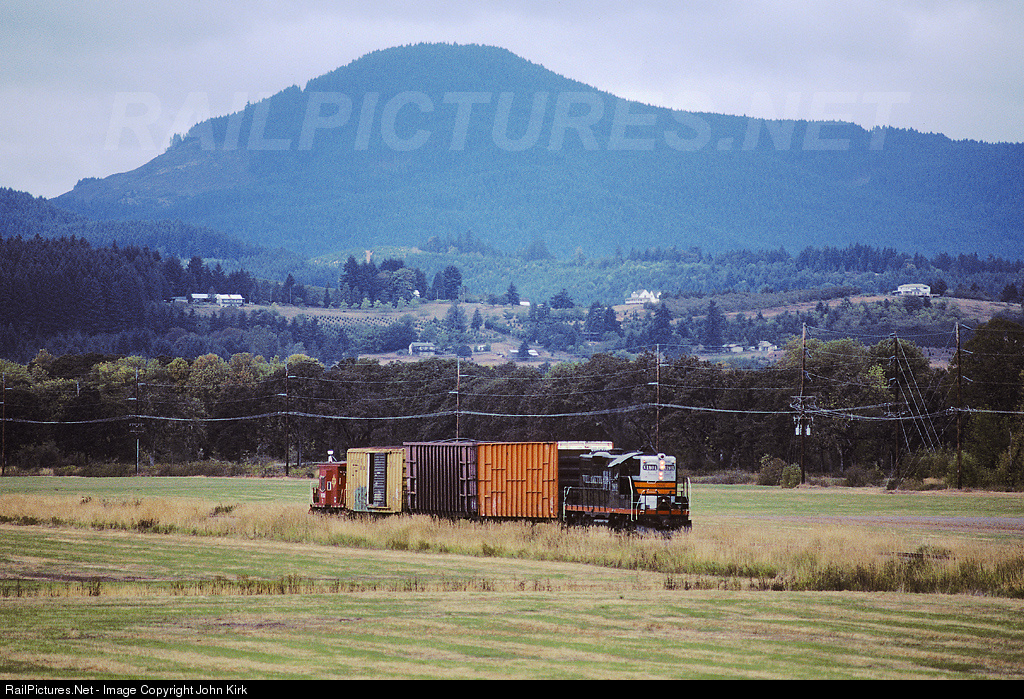 Willamette and Pacific Railroad (WPRR) EMD GP9E (SP Black Widow) with loco, 3 freight cars, and caboose propel the Dawson Hauler with caboose leading to the last steam-driven lumber mill in the USA. Seen trundling away from at Alpine Rd, Dawson
