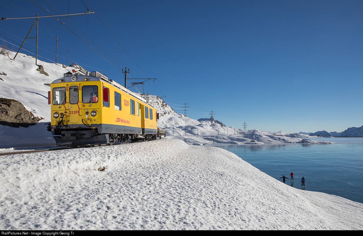 | Electric railcar Xe 4/4 # 23201 of RhB infrastructure from Poschiavo, rebuilt in 2012 from railcar ABe 4/4 # 48, running along the frozen Lago Bianco from Alp Grüm to Ospizio Bernina. |