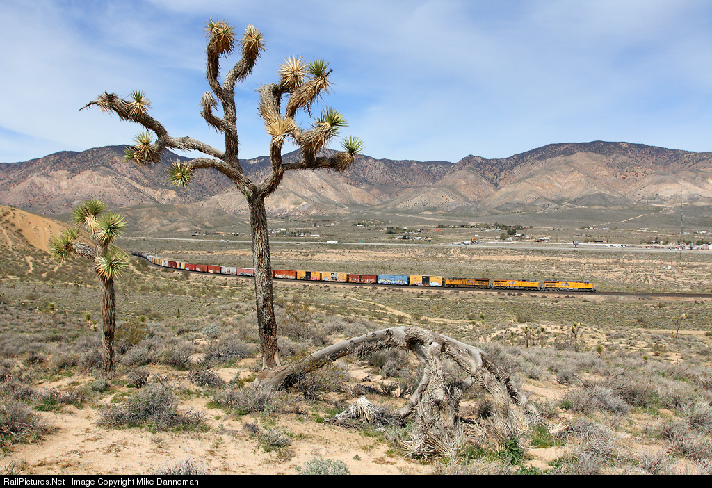 Dropping down the eastern grade of Tehachapi Pass is an southbound Union Pacific manifest freight passing milepost 375 at Warren, California, on February 28, 2016. In the foreground are Joshua trees—one of them slowly bending back to the earth after succumbing to a harsh Mojave Desert environment.