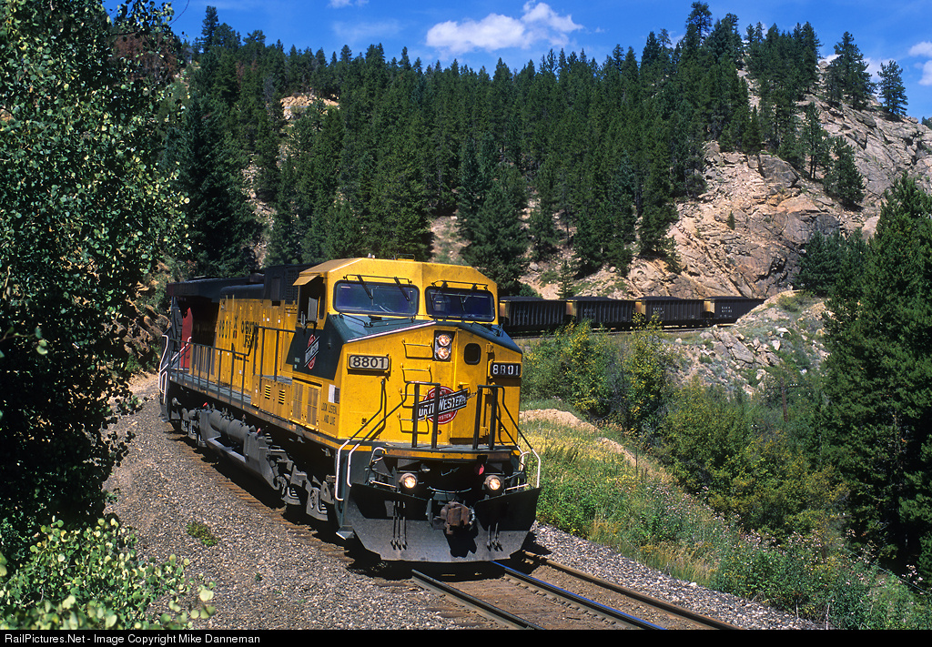 Chicago & North Western GE AC4400CW No. 8801 leads a Union Pacific coal train eastbound out of Pinecliffe, Colorado, on August 25, 2001.