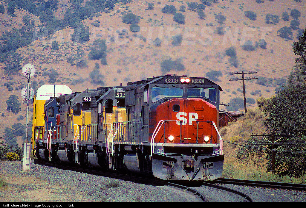 | UP West Manifest with 9806 (SP), 3231 (UP), 4435 (UP), 6084 (HLCX), SD70M/SD40-2/SD40T-2/SD40-2, curving into Walong, Tehachapi Loop |
