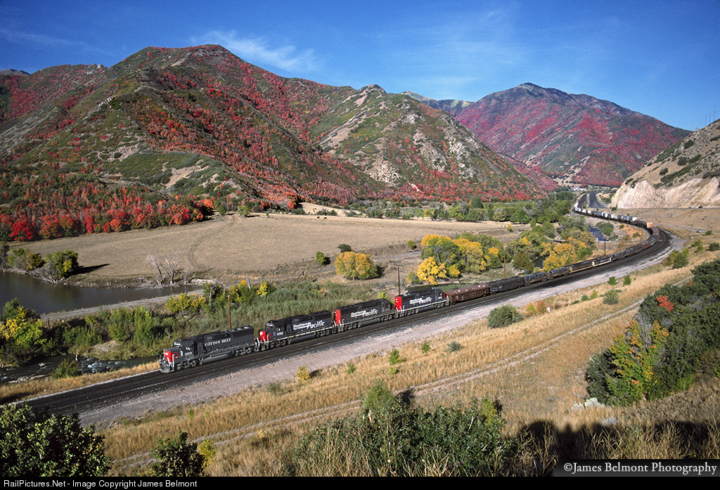 With colorful oak brush along the foothills of Loafer Mountain, SP's Roseville to Denver Forwarder charges east up Spanish Fork Canyon with 66 cars on Sept. 24, 1994.