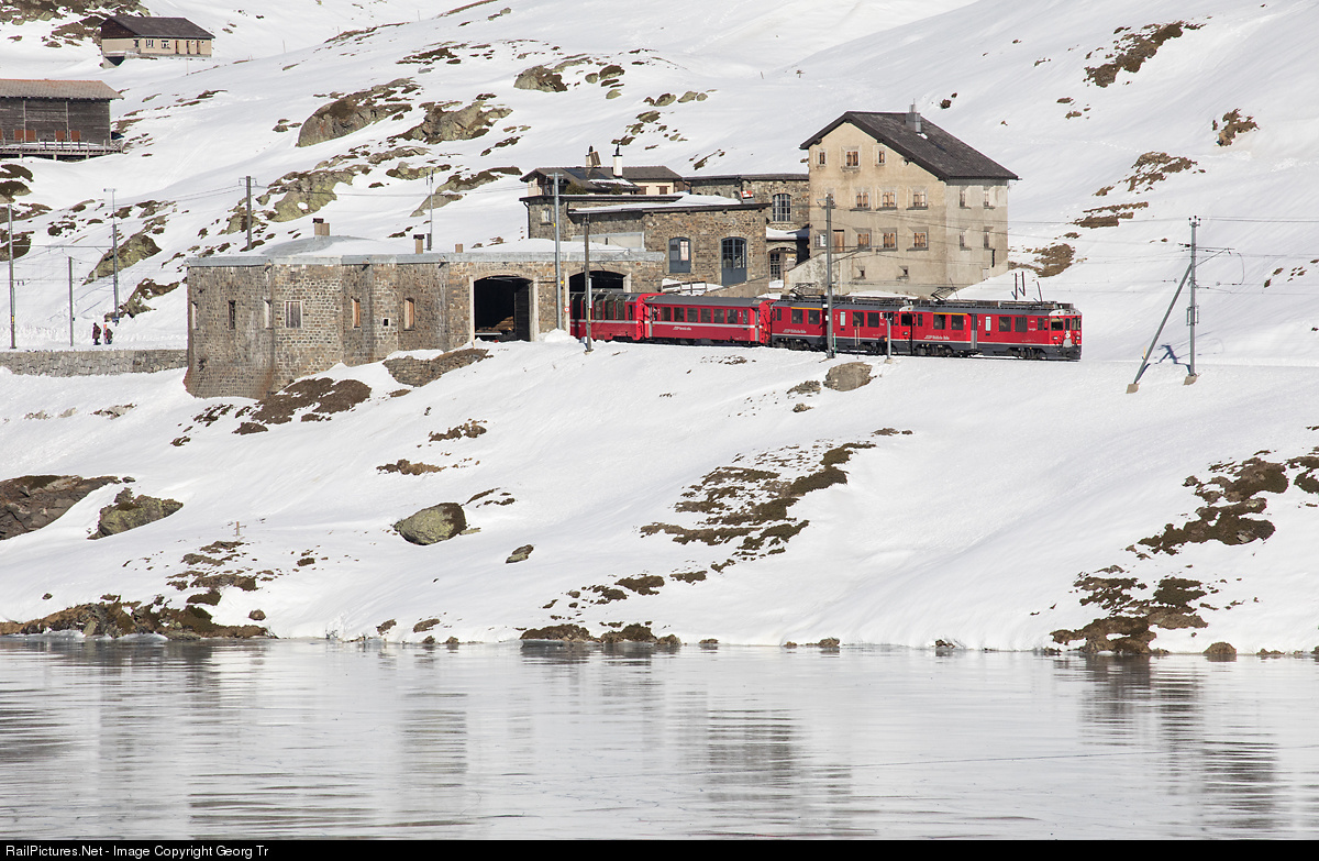 Regional train 1625 from St.Moritz to Tirano is leaving Ospizio Bernina, pulled by railcars ABe 4/4 # 56 "Corviglia" and # 53 "Tirano". The large house with shuttered windows is a former trackman house, now hired out for holiday makers. The building, where the train is running through, houses a covered turntable for the steam snowblower in the left part, not used nowadays anymore.