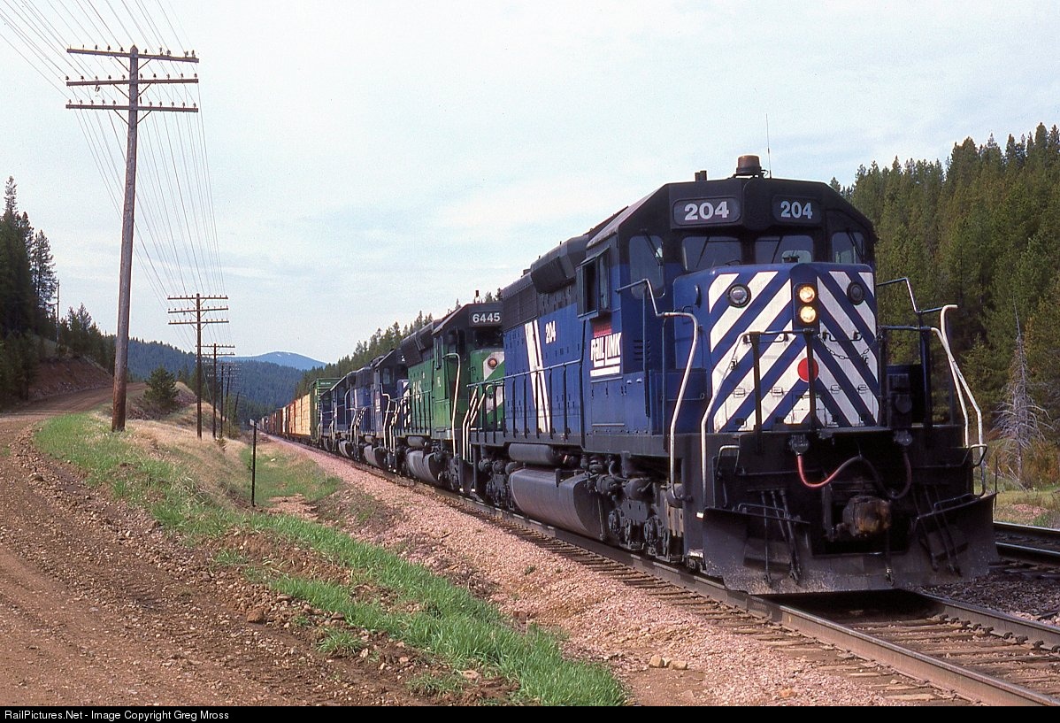 MRL 204 leads a train up Mullan Pass in May of 1990.