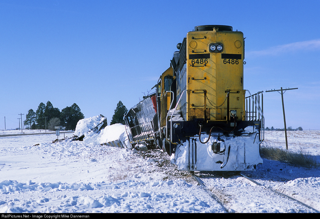 A westbound Kyle plow extra derailed on a icy crossing at Kanorado, Kansas, on January 2, 2007, and fortunately no one was injured in the mishap. In this view looking west not long after the derailment shows the rear of the plow train with former Santa Fe and HTCX SD45-2 (labeled a SD40-2R) No. 6486. EMD CEFX SD45T-2 No. 9282 leaned over with the plow, and derailed trailing sister No. 9245, leaving No. 6486 still on the rails. In the next day or so, the locomotives will be rerailed and track repaired. Wrecked plow MWK 06 didn’t fair so well. It was simply left there for the winter, finally cut up for scrap after languishing there for a couple years.