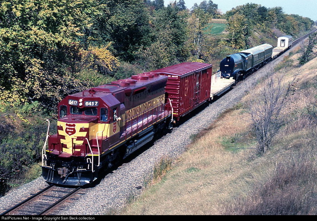 Led by a Wisconsin Central SD45, the Dwight Eisenhower steam special has departed its home at the National Railway Museum in Green Bay as it heads southwest toward Abilene, Kansas, for a ceremony celebrating Eisenhower's 100th birthday. Tom Bowers photo.