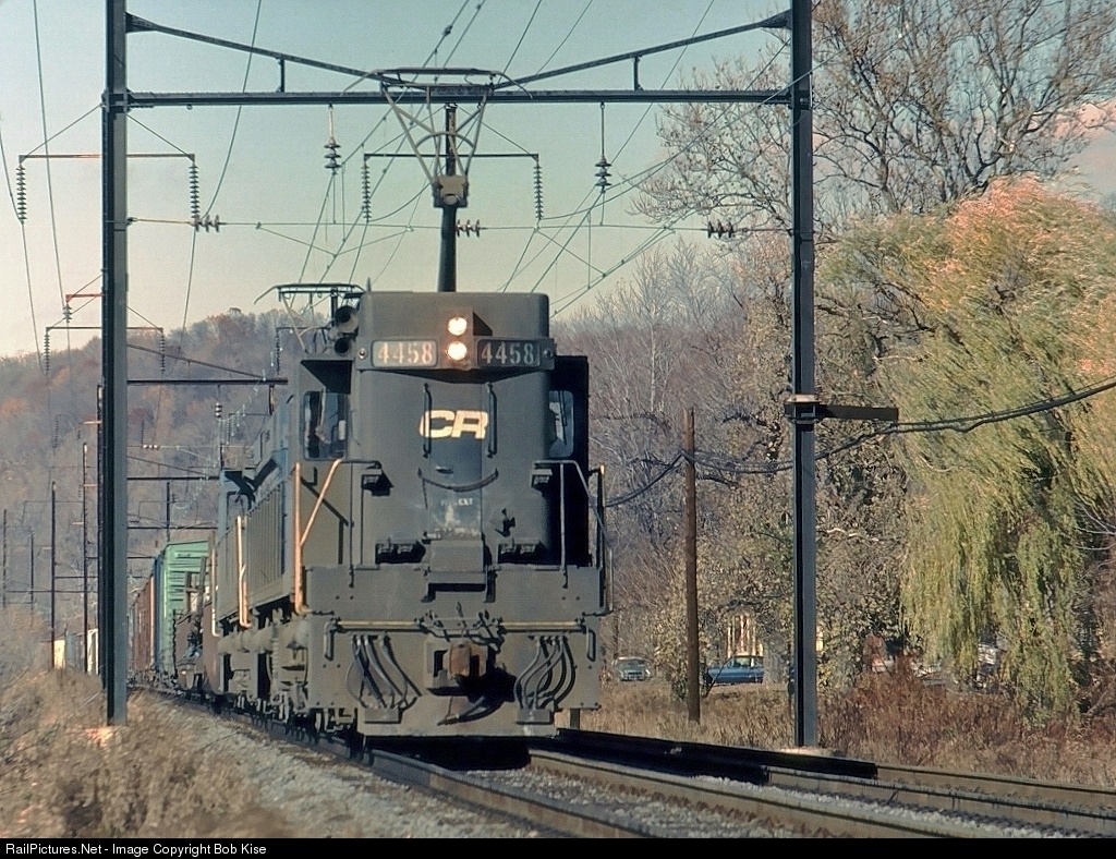 An eastbound E44-powered Conrail freight skirts the river hills along Water Street. I can vividly remember my grandparents taking me at age 6 to a New Year's Eve 1965 service at the Methodist church across the street. Exiting the church at twelve midnight, we were treated to an eastbound train powered by E-44s with their traction motor blowers howling; my grandmother said, "there's your first train of 1966!" Lead locomotive 4458 in this photo was built by General Electric for the Pennsylvania Railroad in May, 1963.
