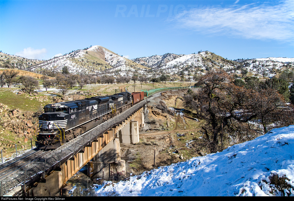 | On the first day of the new year, a solid set of NS units grace the front of an empty rail train bound for Port Stockton as they drift downgrade through Woodford amiss spotty snow blanketing Tehachapi left from the previous evening's storm. |