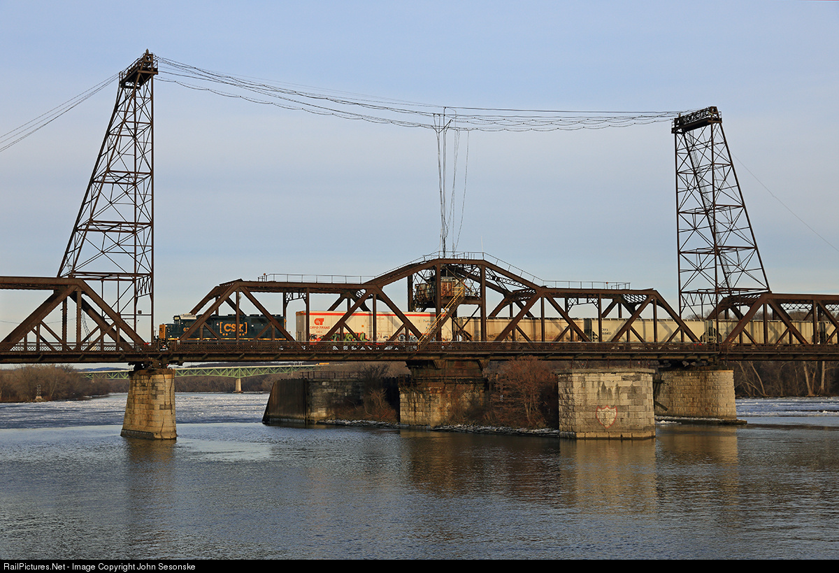 The CSX Troy local is returning WB to it's South Schenectady base with 11 cars that include a reefer and empty grain and salt hoppers. The local is crossing the swing portion of the Livingston Ave Bridge. Opened in 1902 by the New York Central, LAB was the northern of the two Albany Hudson River bridges. Prior to the closure of Albany Union Station and Penn Central's move to a Rensselaer station, this was also known as the freight bridge. However, today only one local freight crosses this bridge 5 days per week versus 6 passenger trains in each direction.