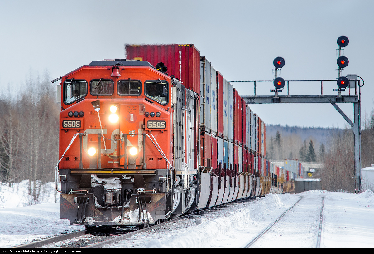 CN SD60F 5505 and SD50AF 5503 climb through Bickerdike East with a Chicago-Prince Rupert stack train.