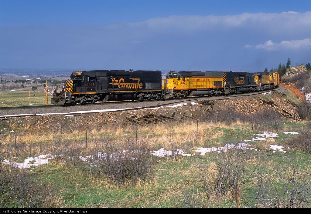 A Union Pacific freight approaches Blue Mountain Drive grade crossing west of Clay, Colorado, on April 14, 2001. Three EMD SD40T-2s and a UP GE AC4400CW power the westbound train, with Rio Grande Nos. 5345 and 5390 bracketing UP No. 8621 (former D&RGW No. 5364), along with UP No. 7093.