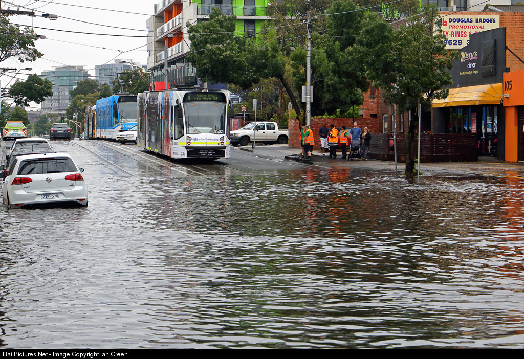Following an afternoon deluge in the Melbourne CBD, three route 6 trams to Glen Iris are blocked by floodwaters in High Street, Prahran.