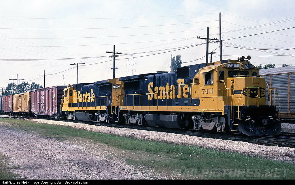 The Santa Fe rostered three B39-8s, numbered 7400-7402. In their first month of service, 7401 and 7402 are seen headed east through Dolton on the Indiana Harbor Belt. Tom Golden photo.