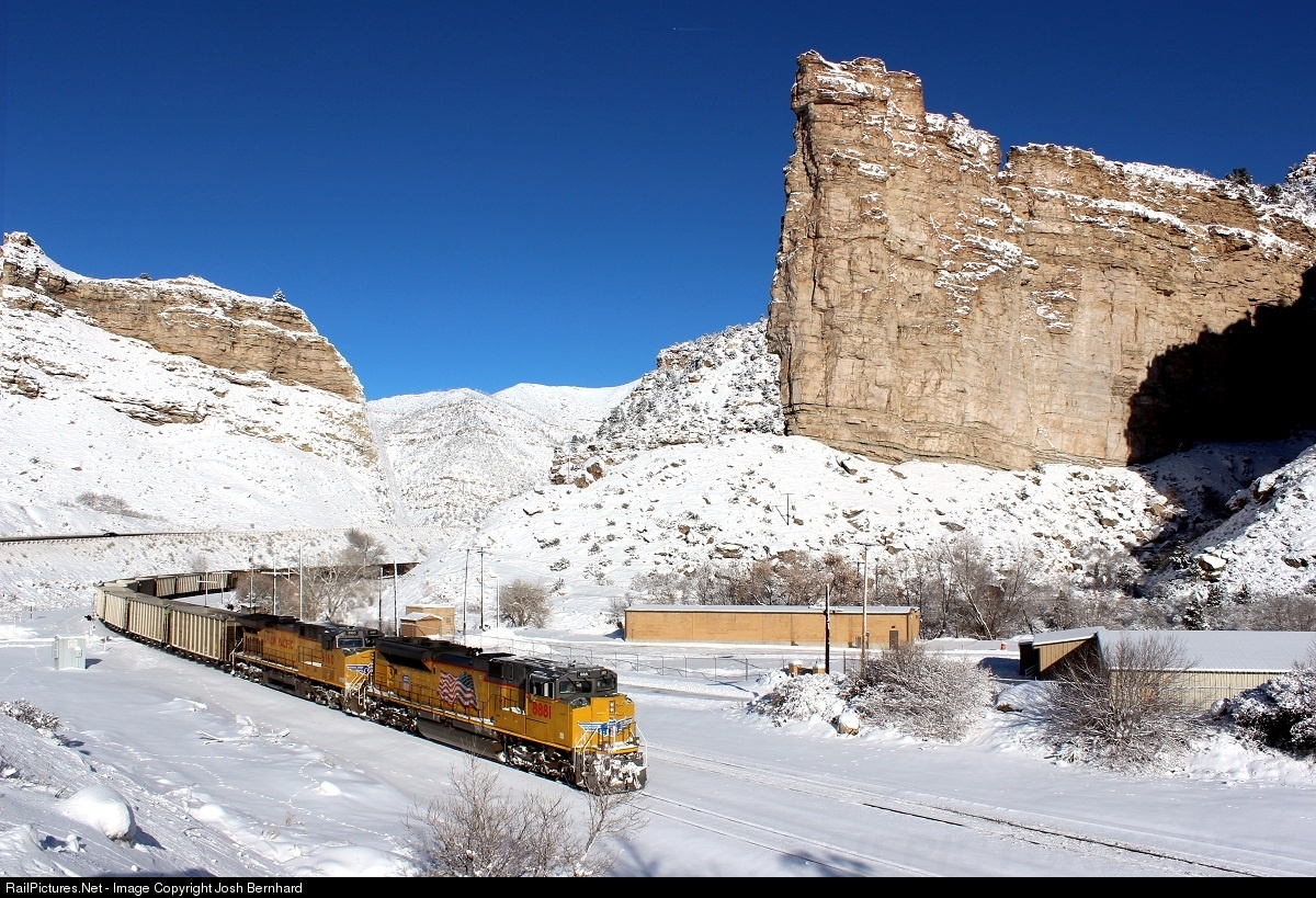 | Don't let that yellow fool you! This train is operated by Utah Railway, not Union Pacific. UTAH employees marked December 26th 2016 with the annotation "The End" on their train schedule after they lost the Savage-IPP coal contract to Union Pacific. That date was the last officially scheduled Utah Railway coal train with the UTAH's signature mid-train helper set cut in halfway. |