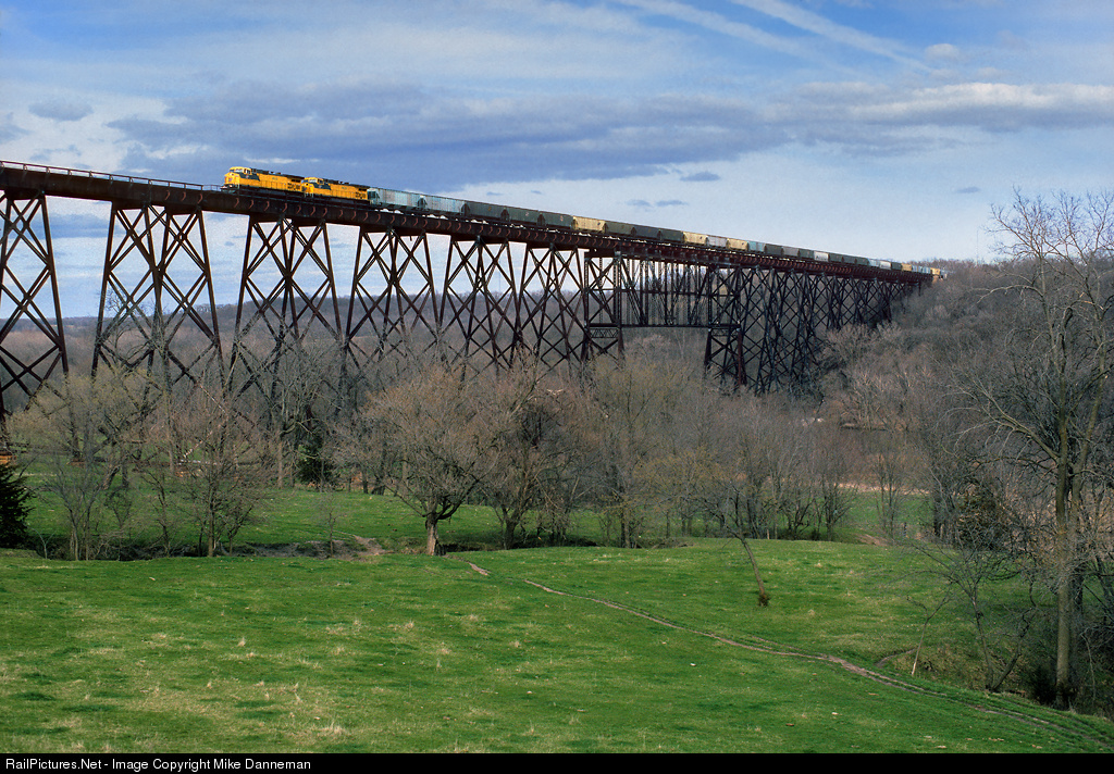 A westbound Chicago and North Western grain train crosses famous Kate Shelley High Bridge west of Boone, Iowa, on April 15, 1995. The 2,685-foot long bridge was built in 1899-1901, and was replaced by a new “Kate Shelley Bridge” built by Union Pacific in 2006-2009. However, the old bridge is still in place to the south of the new one.
