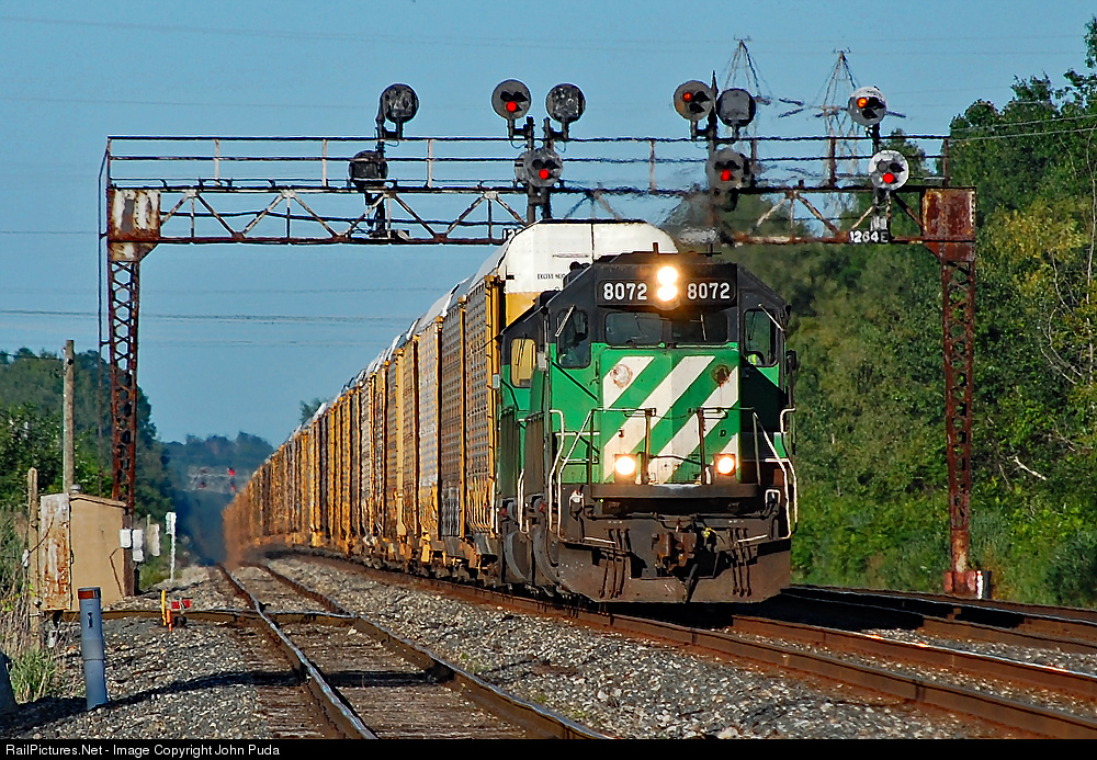 A pair of former Burlington Northern SD40-2's lead westbound auto rack train Q227 under the NYC signal bridge at MP 126 in Ashtabula.