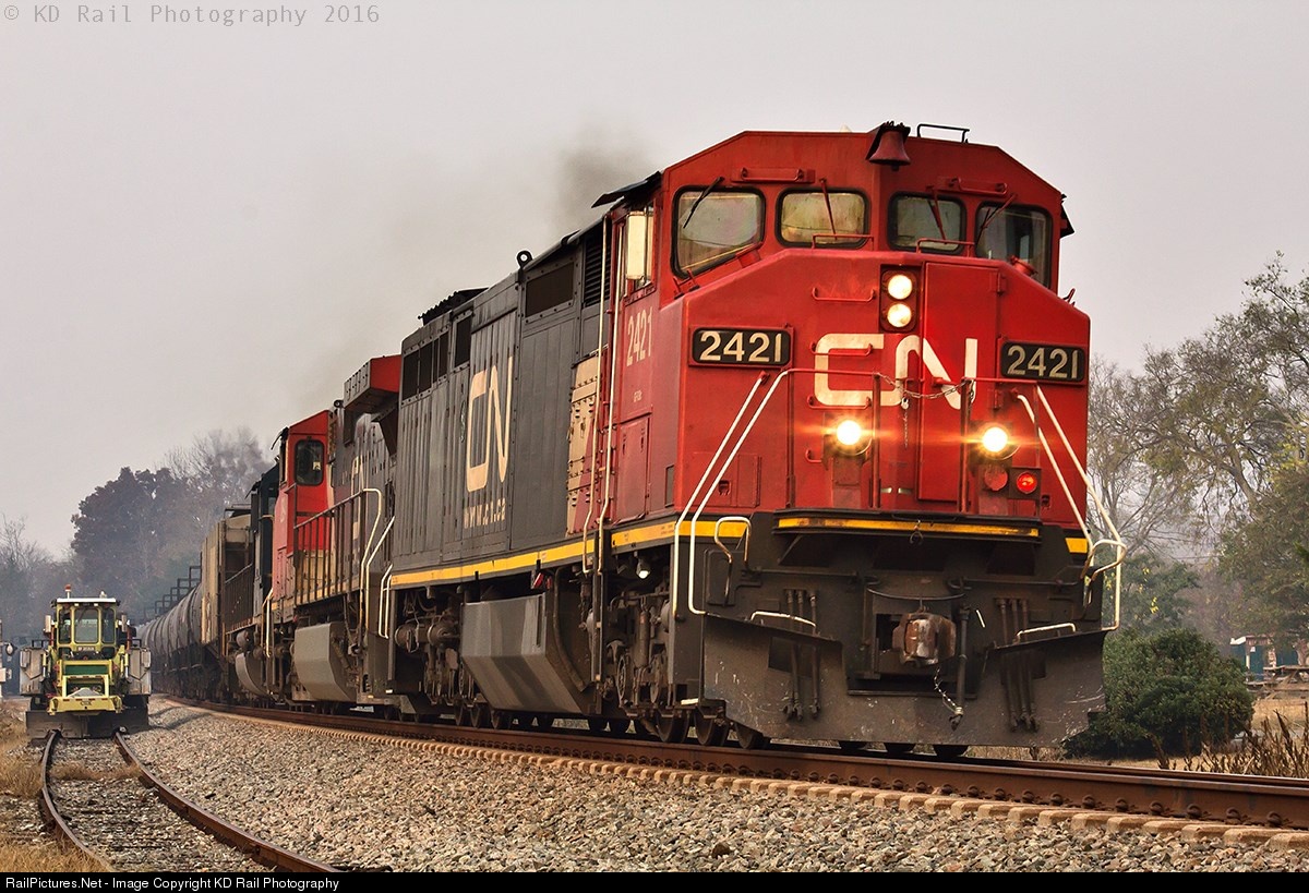 Even in Northwest Georgia visibility is still low due to the wildfire in the surrounding area. CSX K445-11 (Iowa/CN-Lawrenceville,GA) lean into the curve in Ringgold,GA (MP WA-115.7 Ringgold) heading south for Lawrenceville,GA on the CSX Western & Atlantic Sub (WA).Let take the time out and talk about the lead motor, CN 2421 is one of 55 C40-8M (non-BCOL) purchase by the CN railroad between the year 1990-1992. The full-width cowl body a Canadian railroad trademark, and the use of a Canada-specific nose and windshield configuration these locomotive differ from the usual modern day locomotive. The trucks also differ, all units built ride on Dofasco trucks identical to locomotives built by Montreal Locomotive Works, Bombardier, and Morrison-Knudsen.
