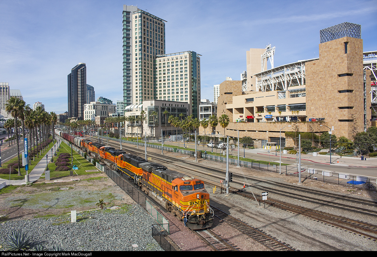 H-BARSDG1-06A arrives in San Diego with a diverse engine consist and train for various customers in the region. Petco Park can be seen on the right. To the left is the San Diego Convention Center, while behind the train is the famous Gaslamp District. The MTS Trolley Main is parallel to the San Diego Sub here. This train is a rarity in daylight, and when it does happen they are typically timed to not interfere with morning commuter traffic, resulting in afternoon runs, making today's arrival a rare opportunity for this angle.