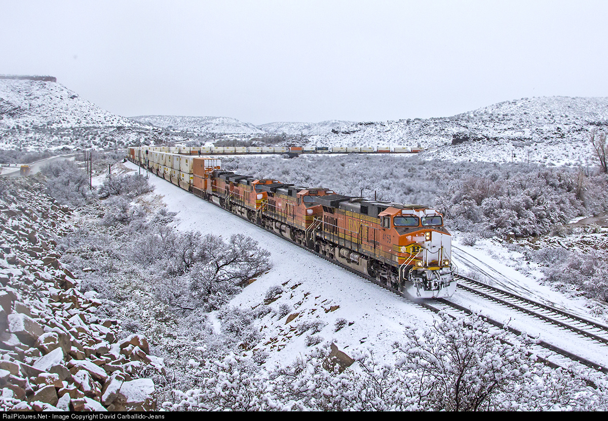 | The first snow storm of year has hit Crozier Canyon during the afternoon of Christmas eve. Within an hour, nearly an inch and half of snow fell; turning Crozier into a winter wonderland. Here, a hot San Bernardino, CA bound Z train navigates out of the snowy canyon as the locomotives show the baggage they carry of snow accumulation on their trip down the Arizona Divide. |