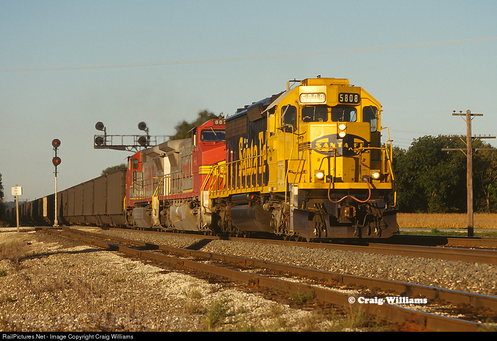 For awhile the Santa Fe/BNSF ran a coal train from New Mexico to Chicago. These trains started in September 1992 and ran from the York Canyon Mine in New Mexico via Raton Pass, to the C&NW at McCook, IL, via the IHB. The C&NW took them up to the Wisconsin Electric Oak Creek plant just south of Milwaukee, WI. Service ended sometime in 1996. It was kind of odd seeing heavy coal trains along the Transcon in Missouri/Illinois where hotshot normally roamed. Here one load passes thru Lomax, 16 miles east of Ft. Madison.
