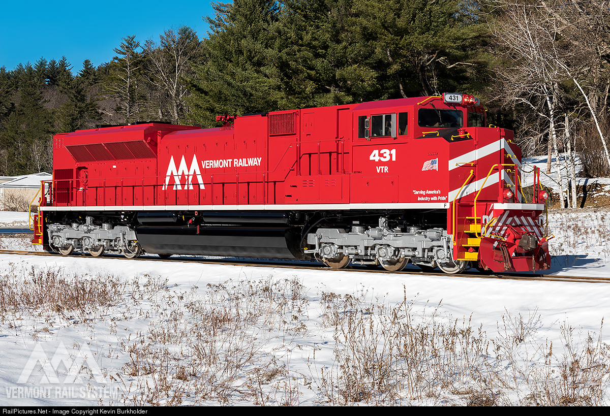 Freshly-painted Vermont Railway SD70M-2 #431, ex-Florida East Coast Railway #101, is posed for an engineer side roster view of the very bright locomotive at Proctorsville, Vermont.