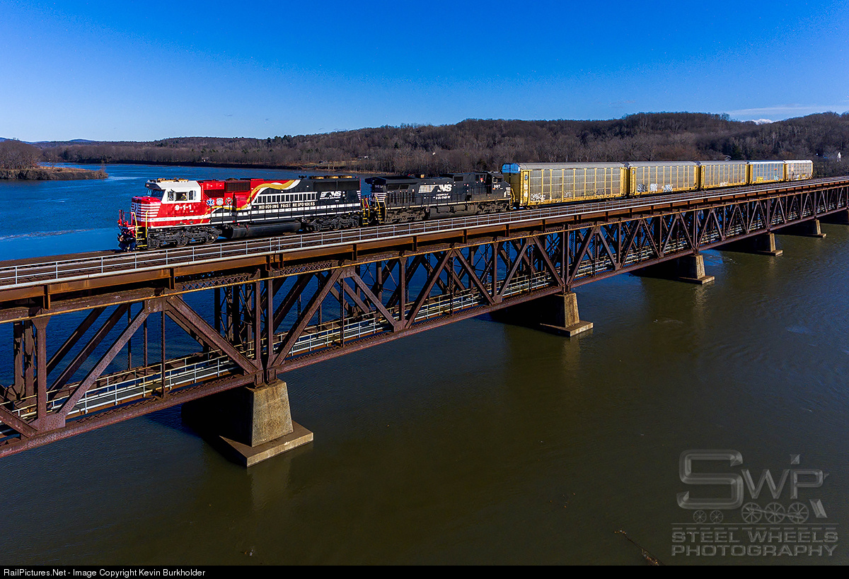 The jointly-operated Pan Am Southern/Norfolk Southern train 287-13 hauling empty autoracks from Ayer, MA to Ohio, is seen crossing the Hudson River at Mechanicville, NY on the Pan Am Southern Freight Main Line with Norfolk Southern SD60E 911 in the lead. !