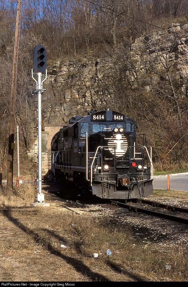 IC 8414 exits the tunnel in East Dubuque, IL in November of 1997. This tunnel is unusual in that it makes a hard 90 degree turn after the trains cross the Mississippi River and the Burlington Northern.