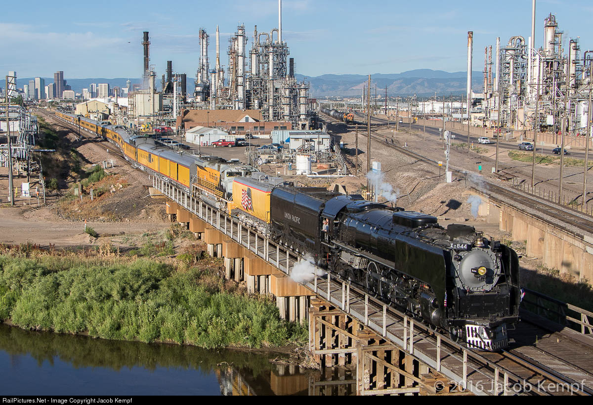 After a three year hiatus, Union Pacific 4-8-4 #844 made a spirited comeback in 2016 pulling the annual Cheyenne Frontier Days Train between Denver, CO and Cheyenne, WY. Shortly after departing Denver Union Station, the 844, assisted by UP 1989, the DRGW heritage unit, enters the single track of the UP Greeley Sub on its journey north. A huge crowd of railfans young and old gathered on the concrete shoulder of I-270 to witness this event!