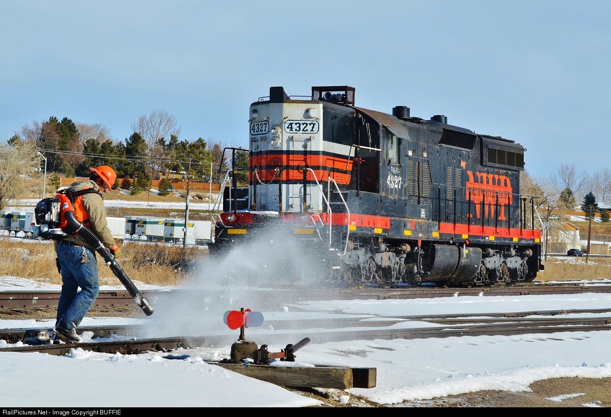 Snow crews work to clear the switches of ice and snow as OmniTRAX's 4327 (SD9 in a Widow Maker paint scheme) waits for her crew.