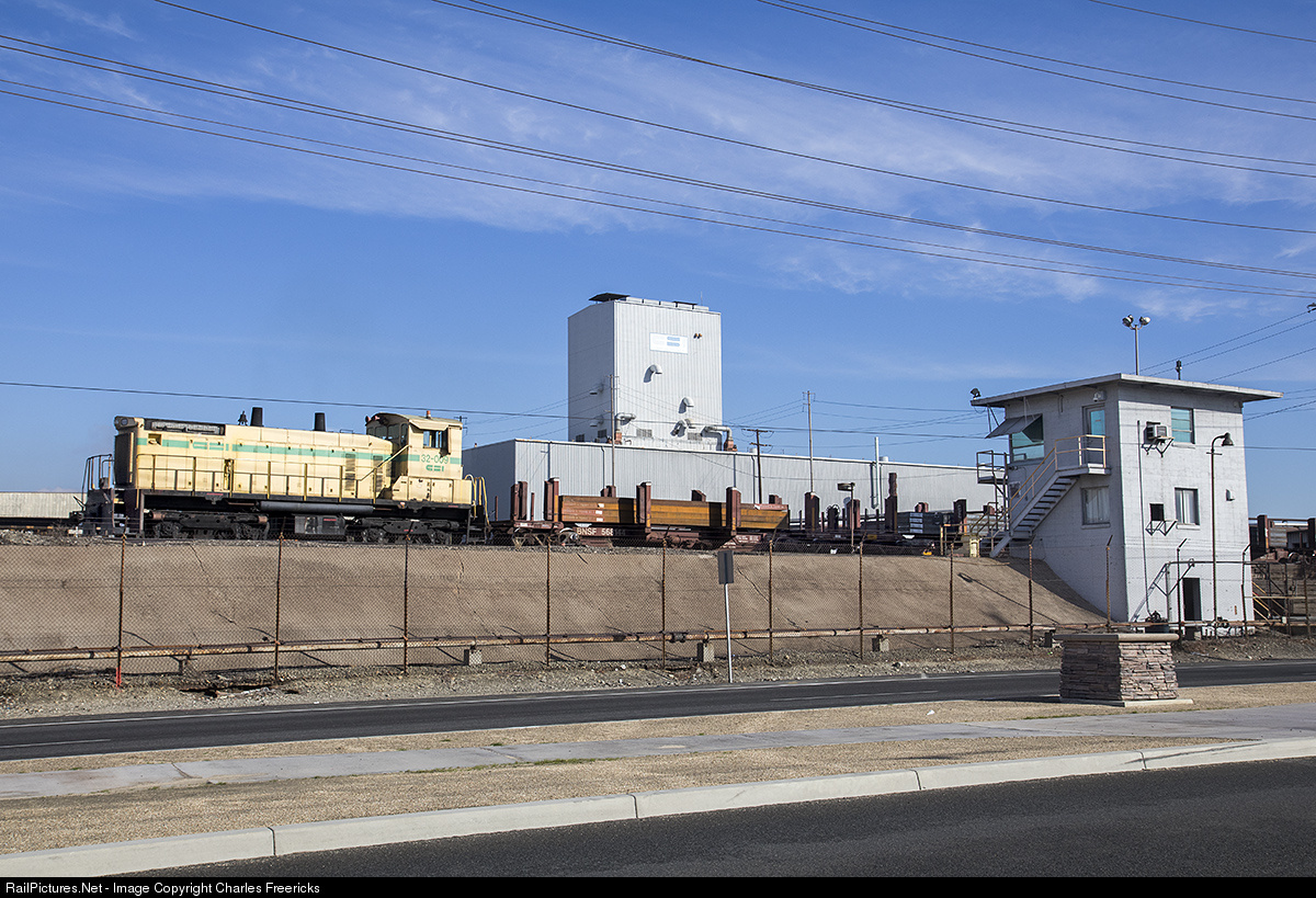 A California Steel Industries SW1500 pulls a cut of slab cars past the scale tower in the remaining portion of the old Kaiser Steel facility.