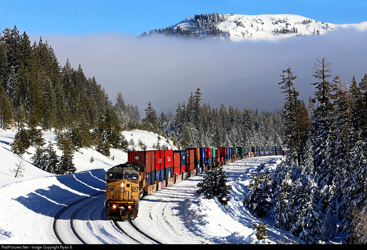 | On a beautiful winter's afternoon near the top of Donner Pass a westbound Union Pacific double stack train approaches Norden as the dense Sierra fog begins to roll in. Looming over the scene and above the fog bank is Mount Judah, under which Union Pacific's Sierra crossing tunnels under the mountain by way of the 10,365' tunnel #41. |