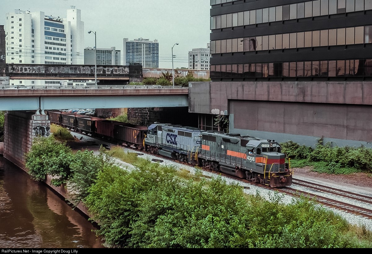 Already a grey railroad, with quite a few variants of its grey and blue paint scheme, also had legacy grey from the Seaboard System, Family Lines, and possibly the L&N and Clinchfield on its roster. Two more shades were added with the 1991acquisition of twenty former D&H/RDG GP39-2’s – D&H lightning stripe grey, and Guilford grey. Here one of the Guilford grey units works with a GP40-2 in an early CSX scheme to bring a string of hoppers under the Kennedy Boulevard bridge, and past the PECO Energy building.