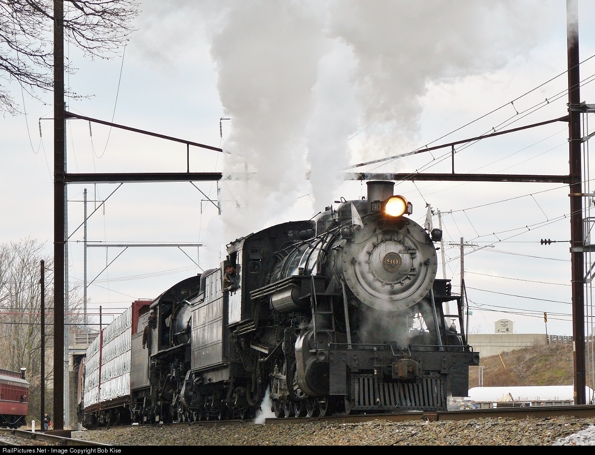 There aren't many places in the world where you can see doubleheaded steam pulling modern freight cars in regular freight service for paying customers. No. 90 & 475 are seen here in a below-the-rails shot on a cold, damp, dreary morning, as they pull their loads toward the switch, in order to couple up to the two coaches that they brought to Leaman Place from East Strasburg.