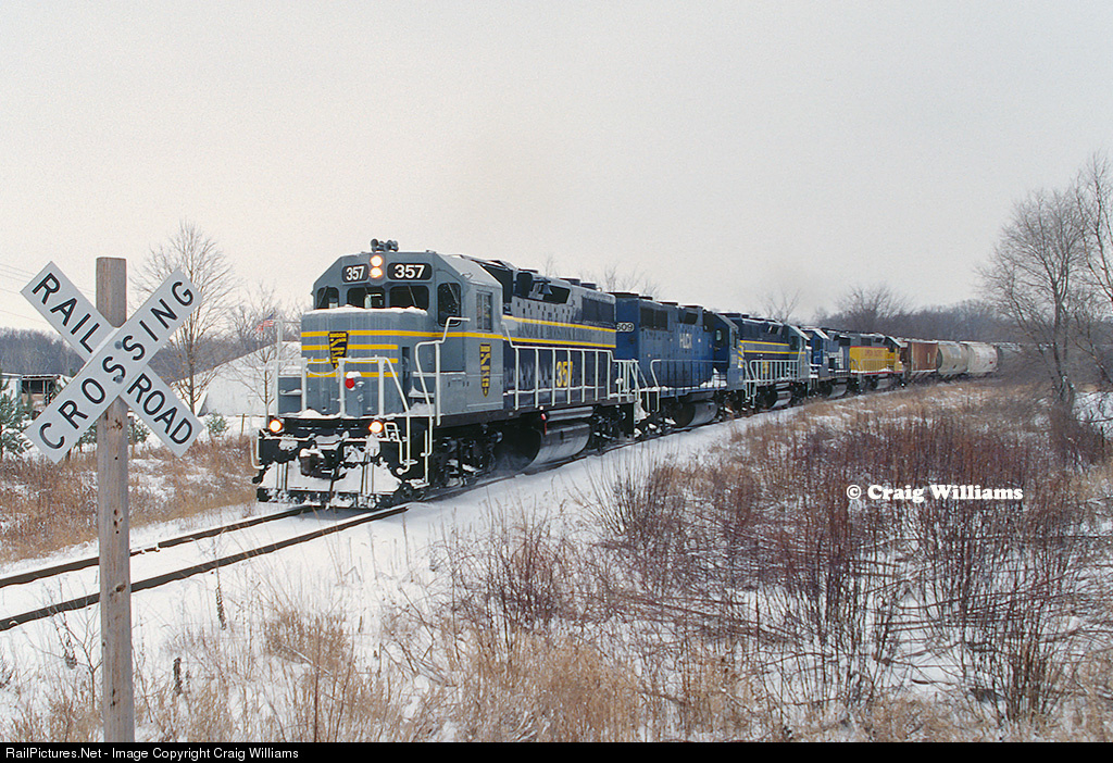 The Iowa Northern's North Crew is working towards Manly with a Union Pacific potash train out of Waterloo. The train is seen here between Cedar Falls and Shell Rock on a snowy February day. When the Iowa Northern was bought by Iron Road Railway (IRR) in 1994, some of their power also came to the property. These units for sister companies BAR and CDAC were rebuilt at National Railway at Silvis. Then the units were tested on a power short Iowa Northern property to have the bugs worked out before being shipped out east. This era lasted only few short years. The 365 was rebuilt from BAR 83, the unit was sold off to WATCO, and is now the WAMX 3828.