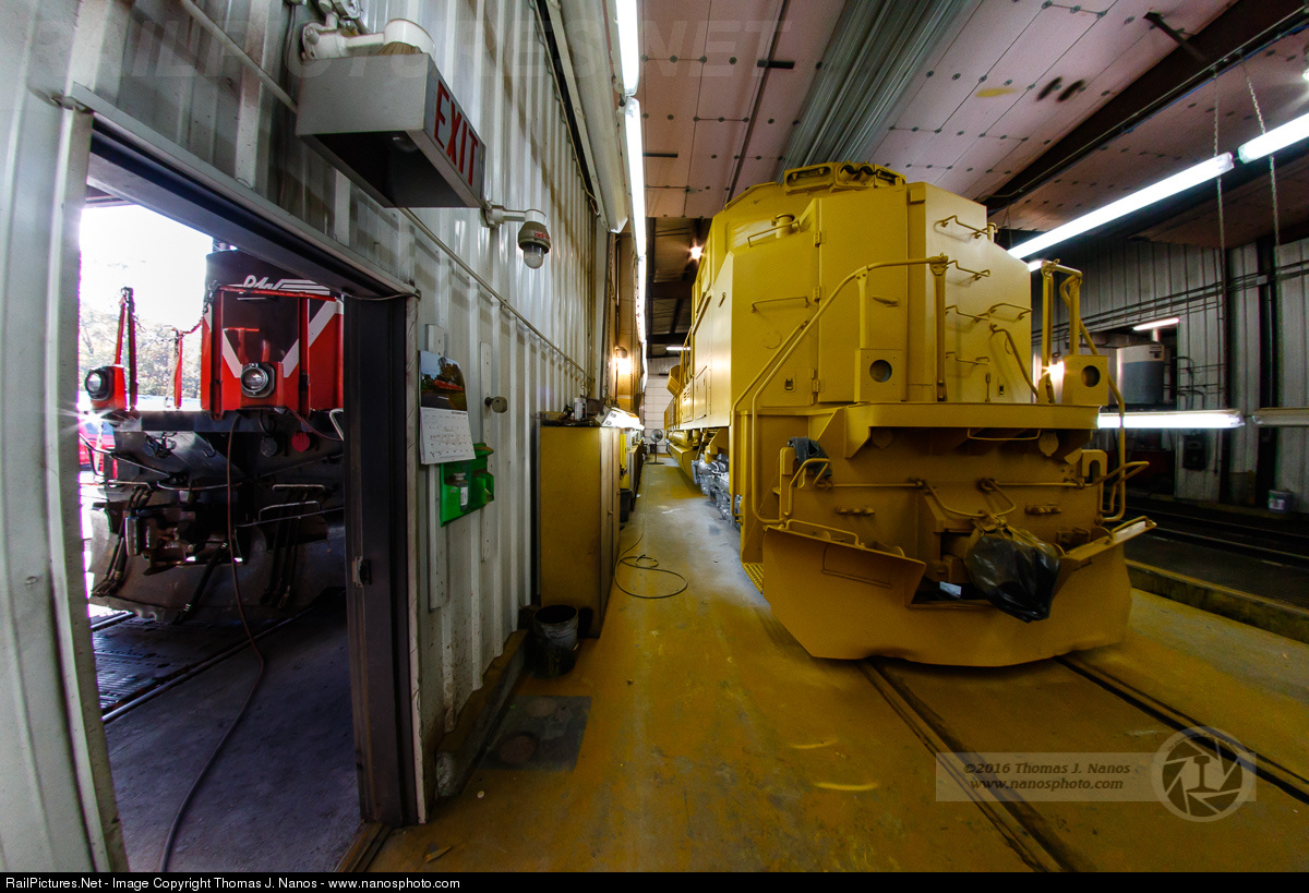 | Inside the Dressing Room - A peek at a relatively naked VTR 431 during her painting process at the Providence & Worcester Railroad's Plainfield, Connecticut paint booth. At this point the entire unit was prepped and primed, the trucks have received their finish gloss silver paint, and the undercarriage is about to get a coat of high gloss black. |