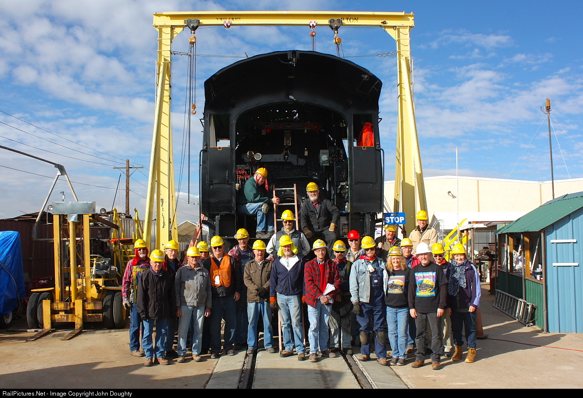 A group photo of the crew that has been restoring Santa Fe Northern 2926 in Albuquerque. The tender has already been restored and the society hopes to have the locomotive ready to run by the end of the year. More information about the restoration of the locomotive can be found at their website: www.nmslrhs.org. Photo taken with permission and wearing protective safety gear.