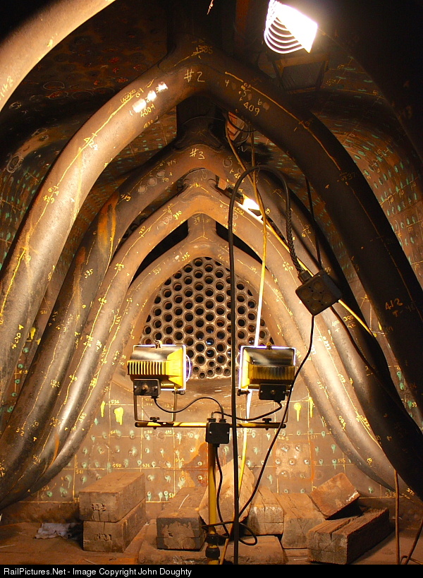 View inside the firebox of Santa Fe Northern 2926 show some of the work that is going into restoring the locomotive. The tender has already been restored and the society hopes to have the locomotive ready to run by the end of the year. More information about the restoration of the locomotive can be found at their website: www.nmslrhs.org. Photo taken with permission and wearing protective safety gear.