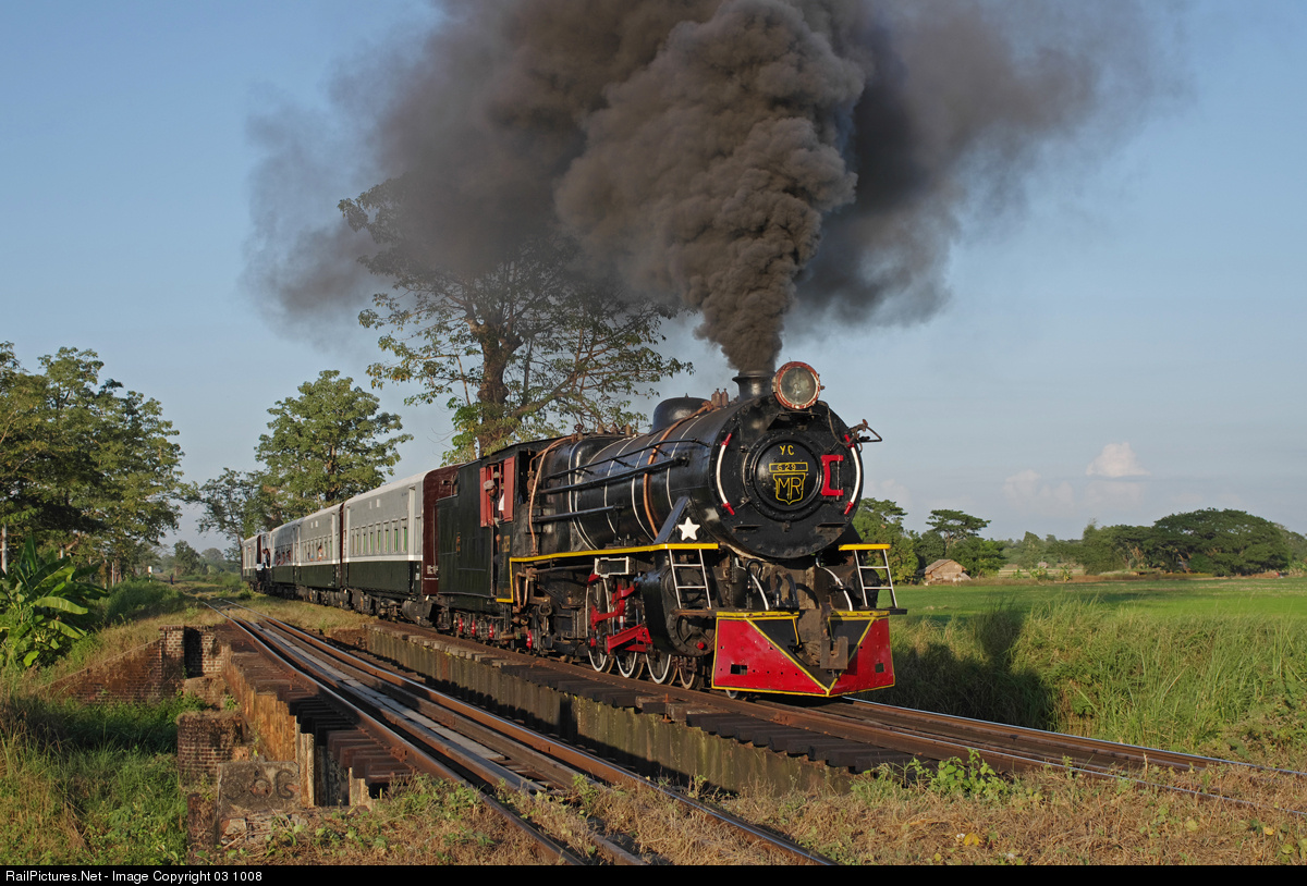 In glorious afternoon sunshine Myanmar Railways Pacific YC 629 returns to Bago with a FarRail photo charter train and crosses a small bridge in the Daiku area south of Pyuntaza.