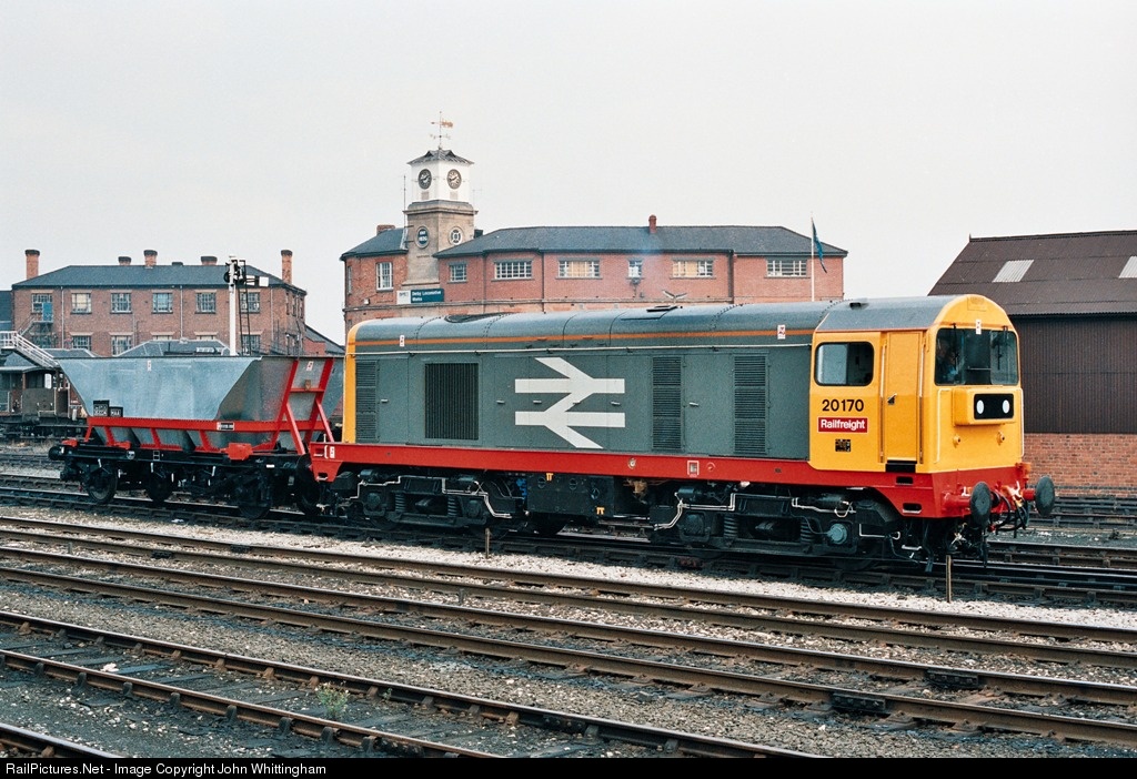 20170 has just received an overhaul at Derby Locomotive Works, whose clock tower is visible in the background. It has also just been repainted in the newly-introduced Railfreight grey livery, replacing the Rail Blue livery it carried latterly. Its train is one equally spotless MGR hopper wagon, number HAA 353224. The locomotive dates from 1966, the wagon is younger.