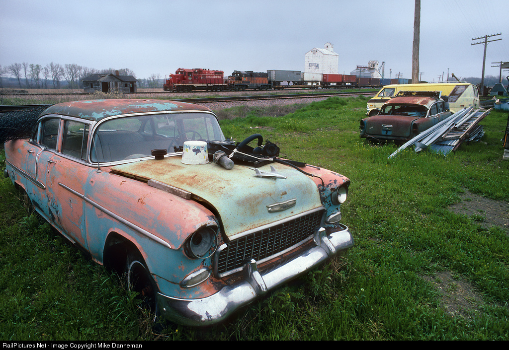 Tattered classics at Dow City Passing through Dow City, Iowa, on May 7, 1995 is a westbound Chicago Central & Pacific freight heading for Council Bluffs. The train is powered by former ICG GP10 No. 1775 and former Milwaukee Road GP20 No. 970, both rebuilt GP9s—and both looking a bit tattered like the the 1955 Chevy—but they’re still running!
