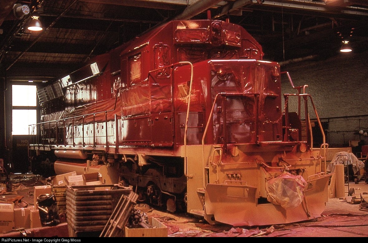 A Wisconsin Central SD45 is getting a fresh coat of maroon and gold at the shops in Fond du Lac, WI in November of 1990.