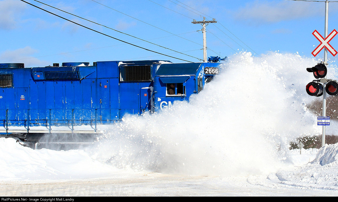 GMTX 2666 leads an eastbound New Brunswick Southern Railway freight, busting through the snow, the day after another snowstorm dumped a crap ton of snow. Just another day in winter 2015.