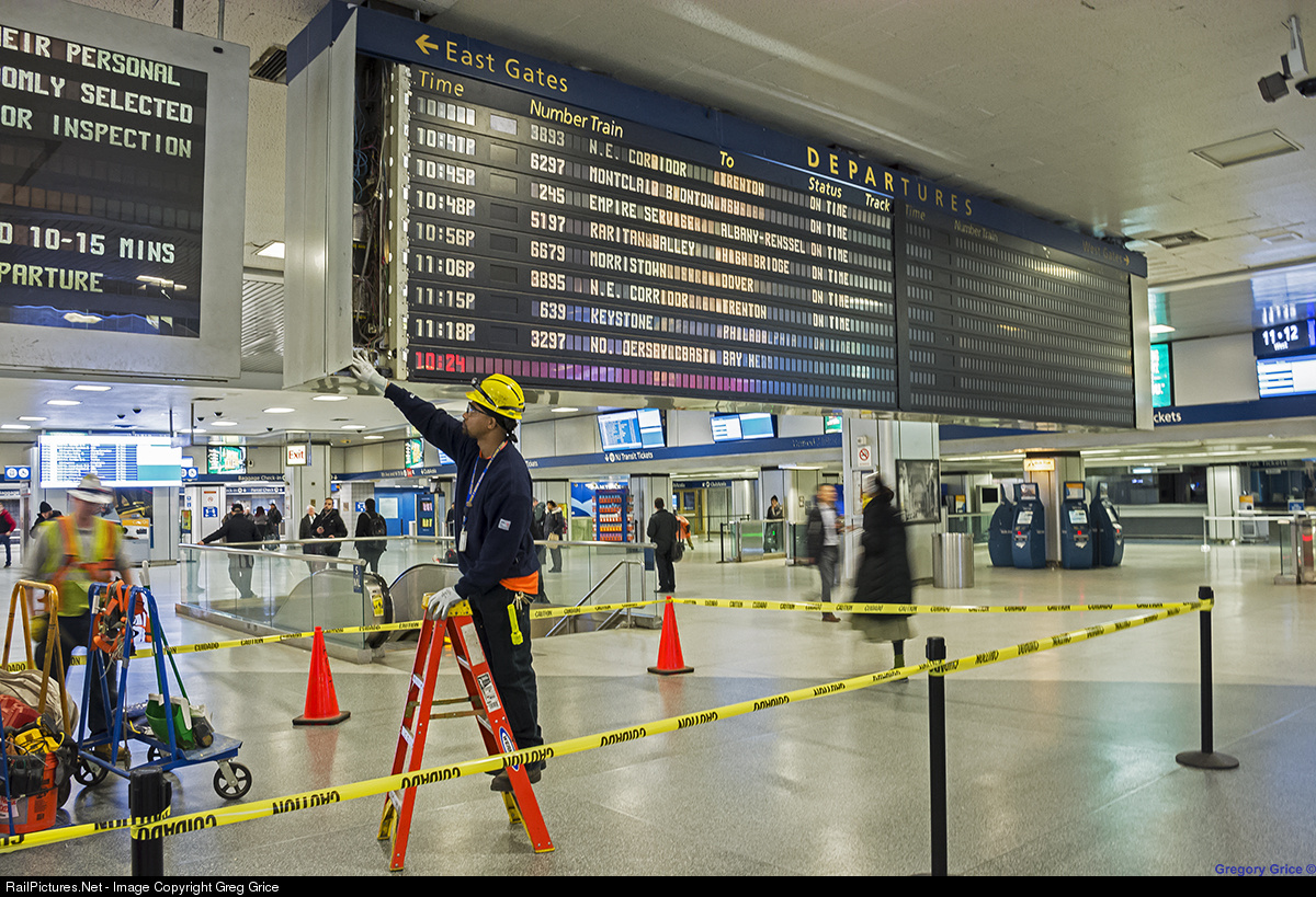 | "Shutting Off the Departure Board at NYP" An Amtrak Electrician flips the switch on the famous Departure Board at New York Pennsylvania Station, turning it off for the last time before being dismantled by contractors. As part of a modernization program, large flat screens were installed throughout the Amtrak concourse months before to replace the board. The official shutdown time for the departure board was 2224hrs (10:24PM), 1/23/17 |