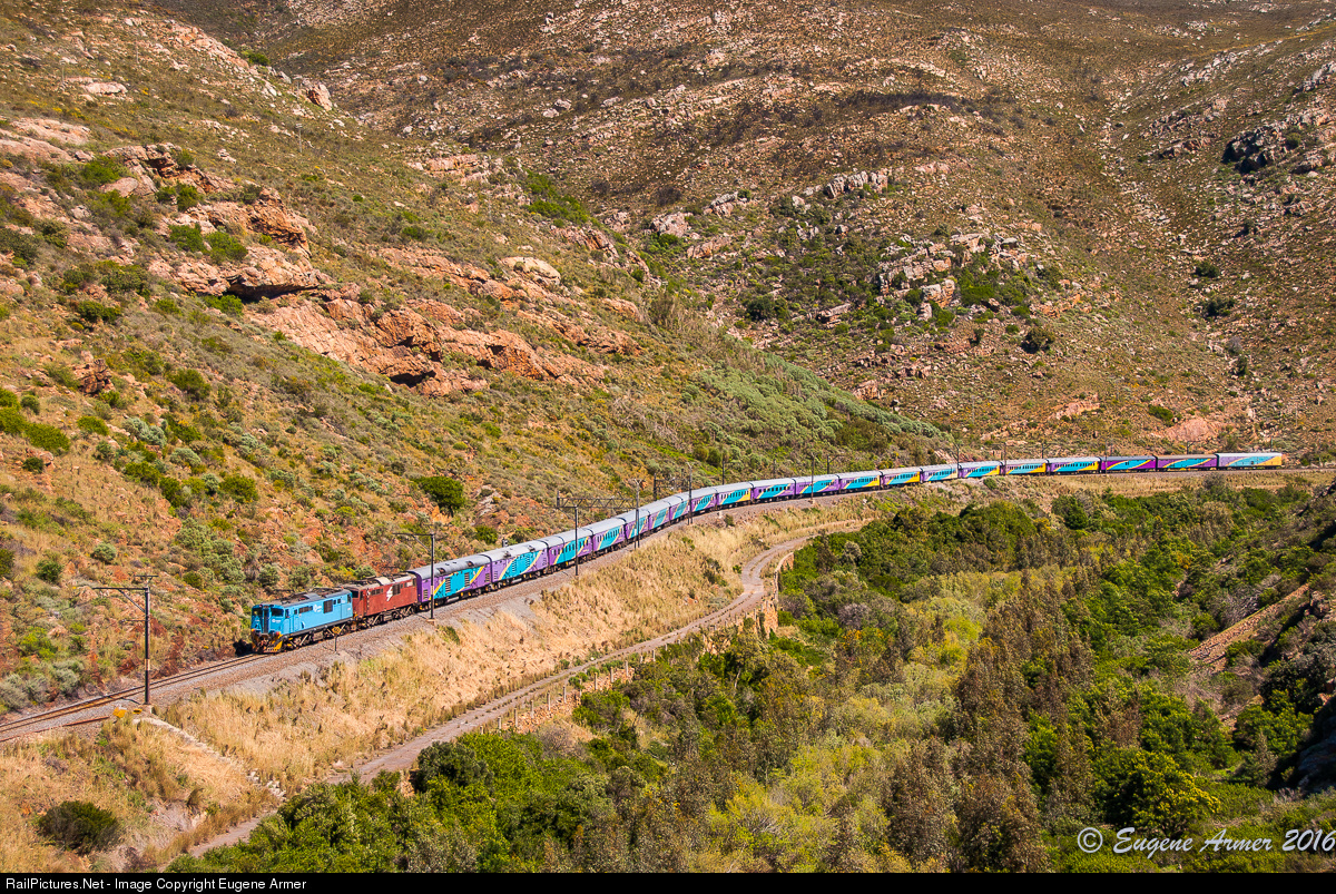 Class 6E1 E1950 in the PRASA blue livery, leads sister E1813 in the oxblood livery of former owner Spoornet, as they team up to work Shosholoza Meyl's 'Trans Karoo' from Cape Town to Johannesburg, seen here in the Nuwekloof Pass near the town of Tulbagh. The pair will take the train as far as Beaufort West, the limit of the 3kV DC section.