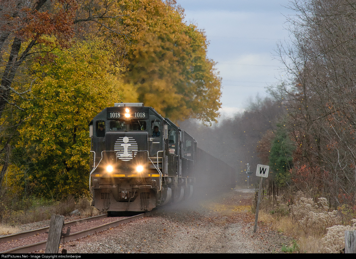 A Bessemer ore train roars south through Greenville, kicking up leaves and dirt.