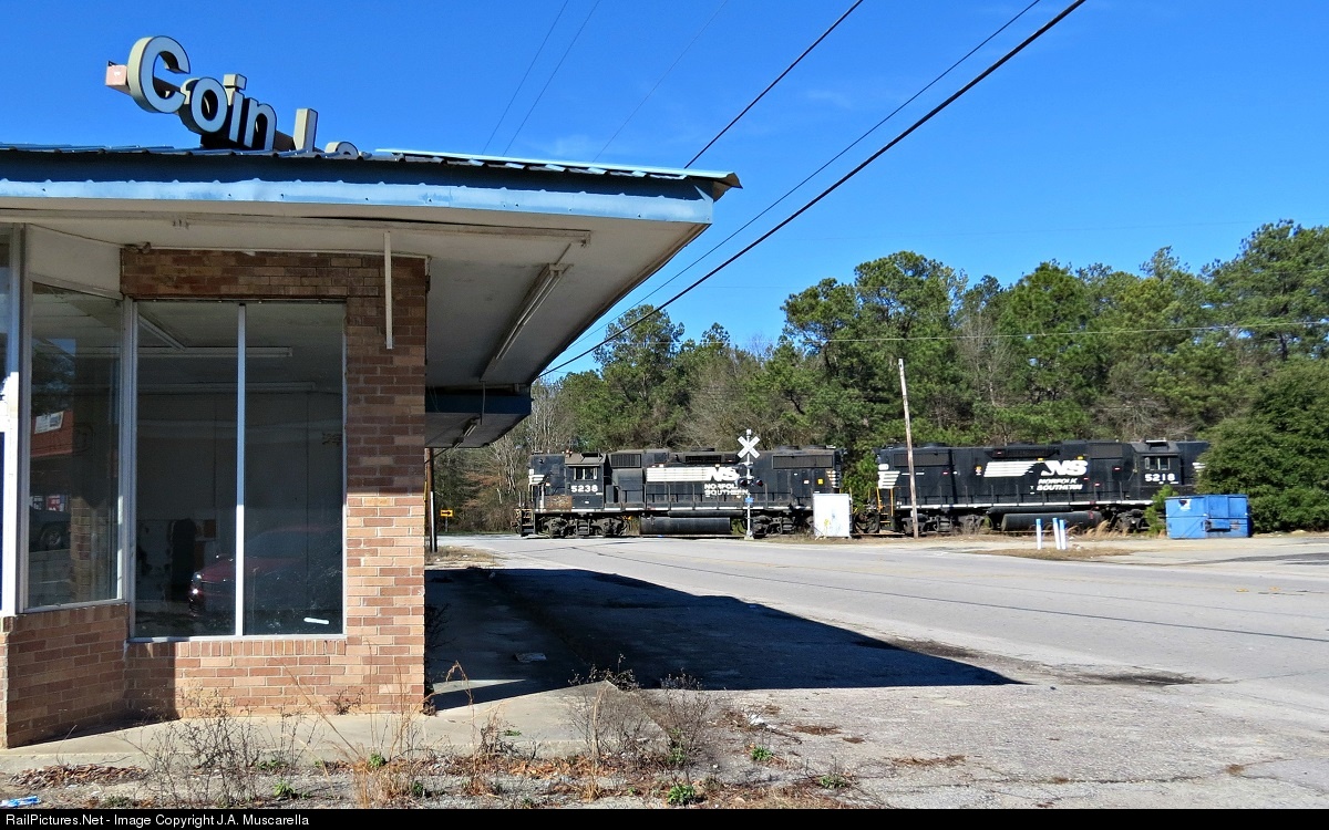 | Making a rare appearance outside the yard, NS Columbia local P77 runs their train down the C-Line with a splendid duo of high hood power. They made a quick stop to pick up a few snacks at the general store and are getting back to work as they move across the grade crossing. To left is an old coin laundromat. This seems like something you might see when the high hoods were standard power in this area... |