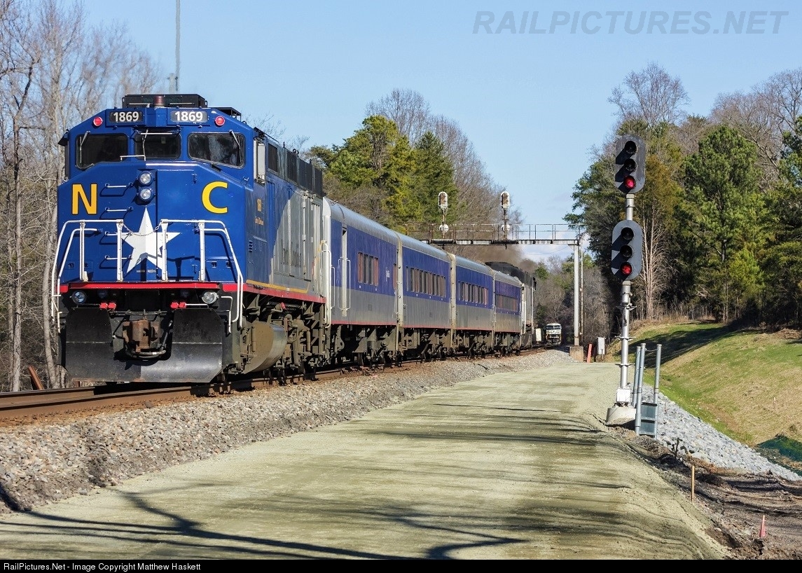 AMTRAK 74 zooms past by me at Haydock it was set that 74 would meet NS 213 here. As you can see 213 waiting for 74 in the background. RNCX 1869 the City of Durham was set up for push service. The Piedmont's have been running that push and pull service for quite some time now.