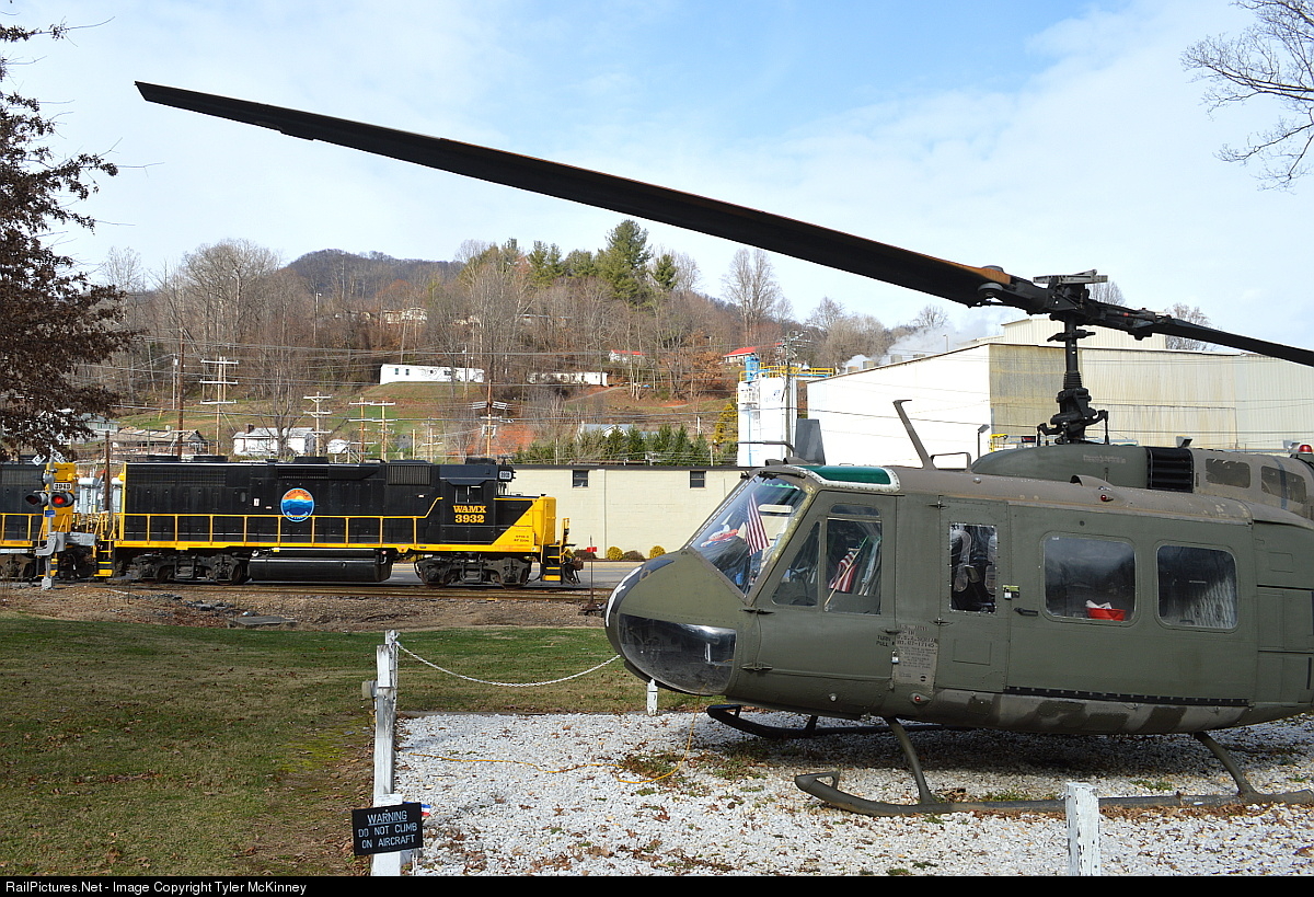 | T59 swaps out cars at Giles in Waynesville. The shot is framed by Bell UH-1 Iroquois, Huey, helicopter parked at the local VFW. |