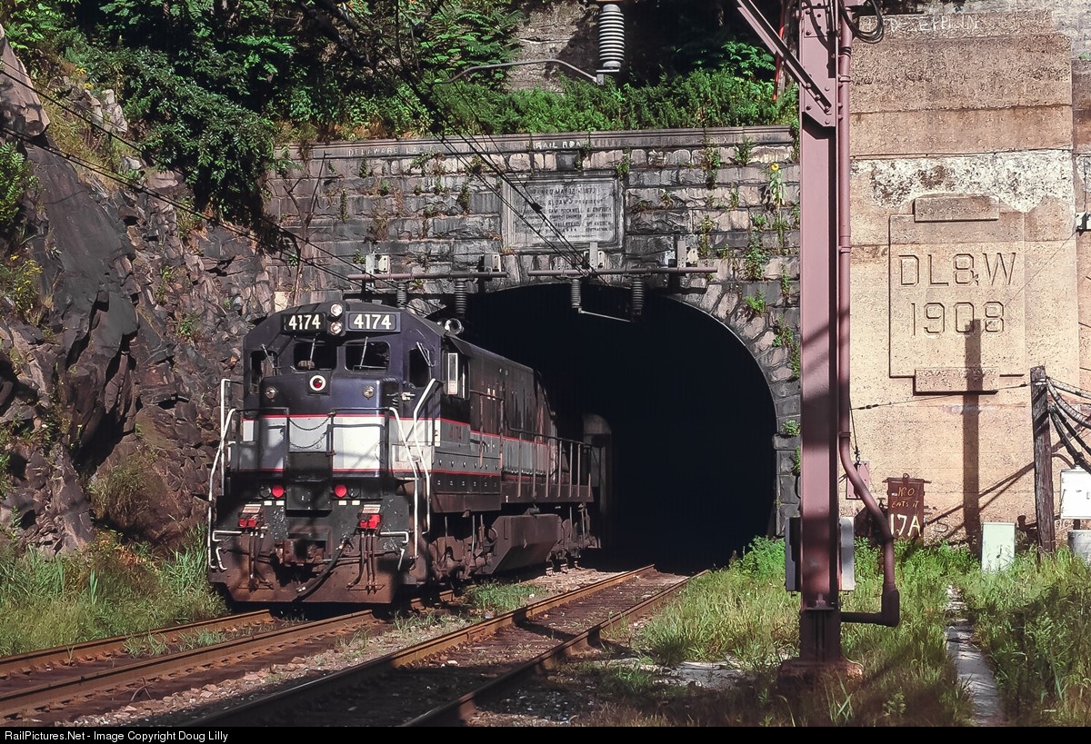Still in the paint that it had when delivered to the Erie-Lackawanna, New Jersey Transit U34CH 4174 emerges from the Hoboken end of the Bergen Hill Tunnels. The southernmost of the two parallel tunnels through the hill, this bore was completed by the Morris & Essex in 1876.