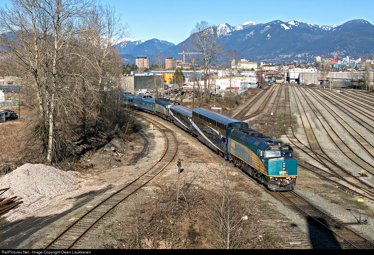 Backing into Vancouver's Pacific Central Station at the culmination of its 2,775 mile journey across the country, VIA's "Canadian" carries an unusual consist at the headend, including two deadheading Park cars, two deadheading Rocky Mountaineer cars, and a midtrain "remote."